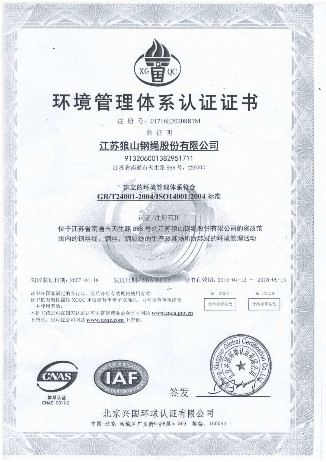 環(huán)境管理體系認證證書